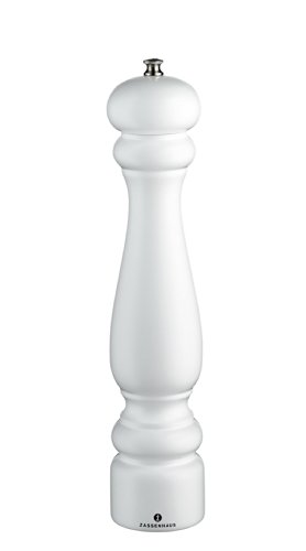 zassenhaus pepper mill/grinder with a high quality german ceramic grinding mechanism.made from beechwood - matt white finish6 different adjustment from powder fine to coarse grinding30cm/11.8in tall - diameter 6.0cm/2.4in.