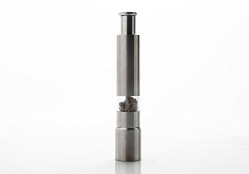 Stainless Steel Pepper Mill GrinderThis innovative pepper mill dispenses spice with speed and ease.Suitable for milling pepper, corn, mustard seed and other small sized spices. All operations are in a simple, one-handed way.Just screw off the bottom for refilling,then press top to grind. Smart gadget to make original pepper powder spice for enjoying a tasty salad or steak. Specification:Size (H x Dia.): Approx. 6 x 1 inch / 15 x 2.7 cm Weight: 192g Material: Stainless steel Color: Silvery Read more details..